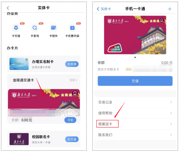 答:目前同一手机上仅可开通一张南京交通卡,因此需要在“南京市民卡App”内将原手机交通卡退卡(或先迁至云端),然后开通南大NFC校园卡。苹果手机请点击:《苹果手机如何先移除原有金陵通卡再添加和找回》 安卓手机请点击:《退卡办法》。