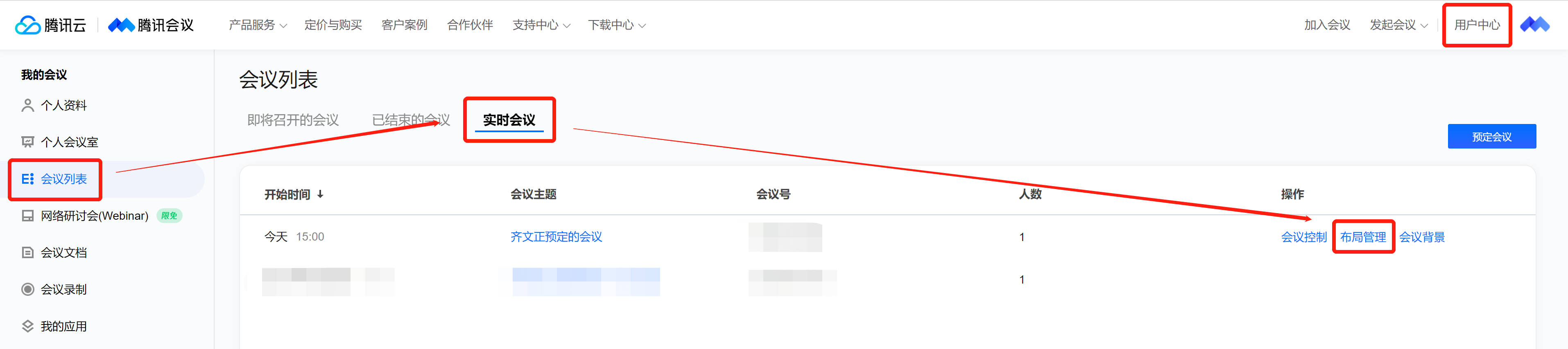 答:使用企业版预定的会议具有自定义布局的能力,主持人登录腾讯会议官网meeting.tencent.com,登录企业账号进入用户中心,在会议列表>实时会议中,找到对应的会议,选择布局管理,然后选择基础布局。