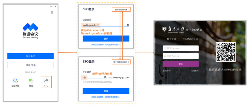 2、通过企业邮箱,请填写nju@nju.edu.cn;或通过企业域名,请填写nju。