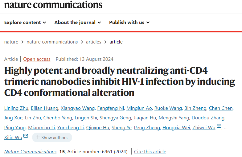 2024年8月13日,吴稚伟和吴喜林课题组在Nature Communications发表了题为“Highly potent and broadly neutralizing anti-CD4 trimeric nanobodies inhibit HIV-1 infection by inducing CD4 conformational alteration”的研究论文。该研究发现强调了抗CD4纳米抗体在HIV治疗中的高效且广谱的效果,对推进HIV的临床治疗具有重要意义。南京大学医学院吴稚伟教授和吴喜林助理教授、清华大学张林琦教授、天津大学王亚鑫副教授和中科院武汉病毒所刘雅兰副研究员为论文的共同通讯作者;南京大学医学院博士生朱林静、黄碧莲为本文共同第一作者。同时特别感谢南京大学化学化工学院郑鹏教授、南京市第二医院魏洪霞主任和中国医学科学院薛婧研究员等的大力支持。该研究得到了国家自然科学基金(No.32370988, 31970149 and U22A20335)和江苏省自然科学基金重点项目(Grant# ZDA2020014),国家自然科学基金重点研发计划(2023YFC2306600),国家十三五传染病重大专项(2018ZX10301406)等项目的支持。