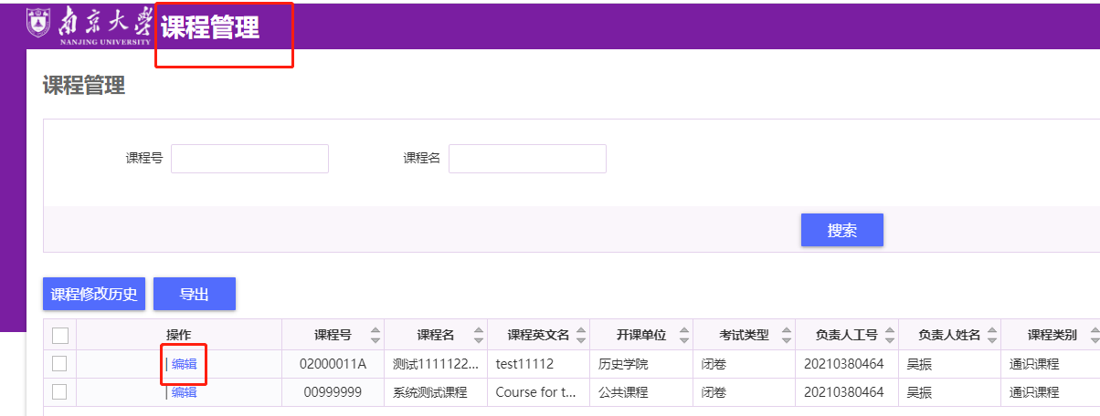 课程负责人通过统一身份认证登录“南京大学网上办事服务大厅”(http://ehall.nju.edu.cn),搜索栏搜索进入“课程管理”。点击列表中对应课程的“编辑”按钮,填写各门课程的详细信息。请将大纲所有内容填写完整,每学期开课前更新维护。如果您负责的课程未出现在此处,是因为课程负责人未能正确设置,请联系院系教务员设置正确的课程负责人。