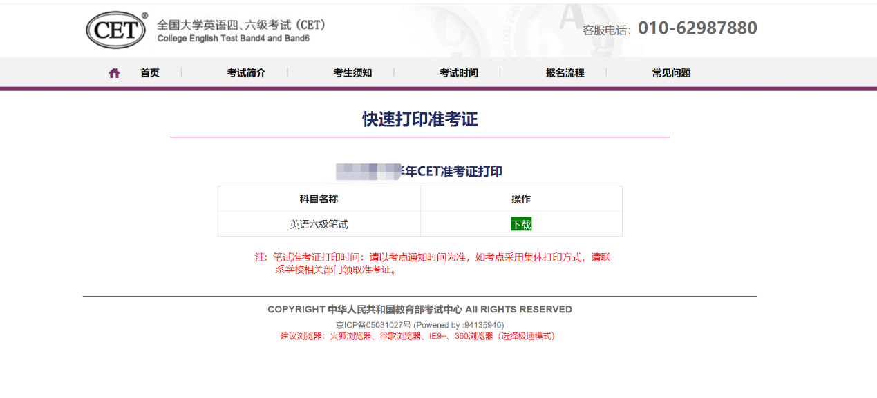 按照省考试院的统一部署,全国大学英语四、六级考试采用教育部考试中心网上报名系统后,准考证由考生自行打印,时间为2025年12月5日10点至12月13日。具体操作详见【准考证打印操作流程】。