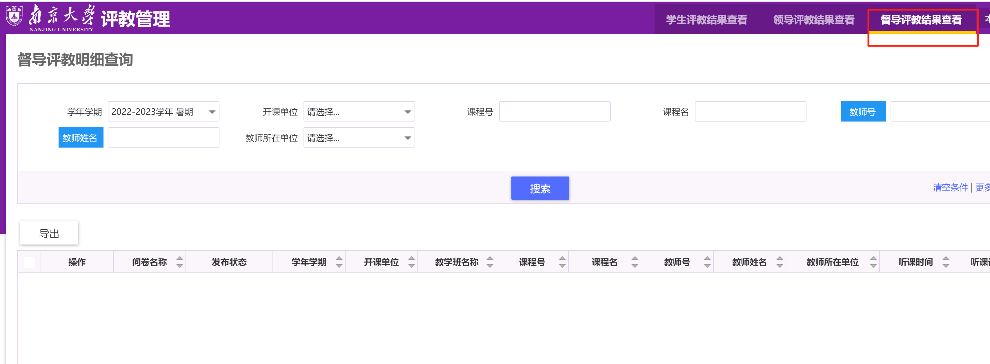 3. 查询督导评教结果:点击上方菜单栏“督导评教结果查看”,在搜索条件里选择学年学期,进行查询。