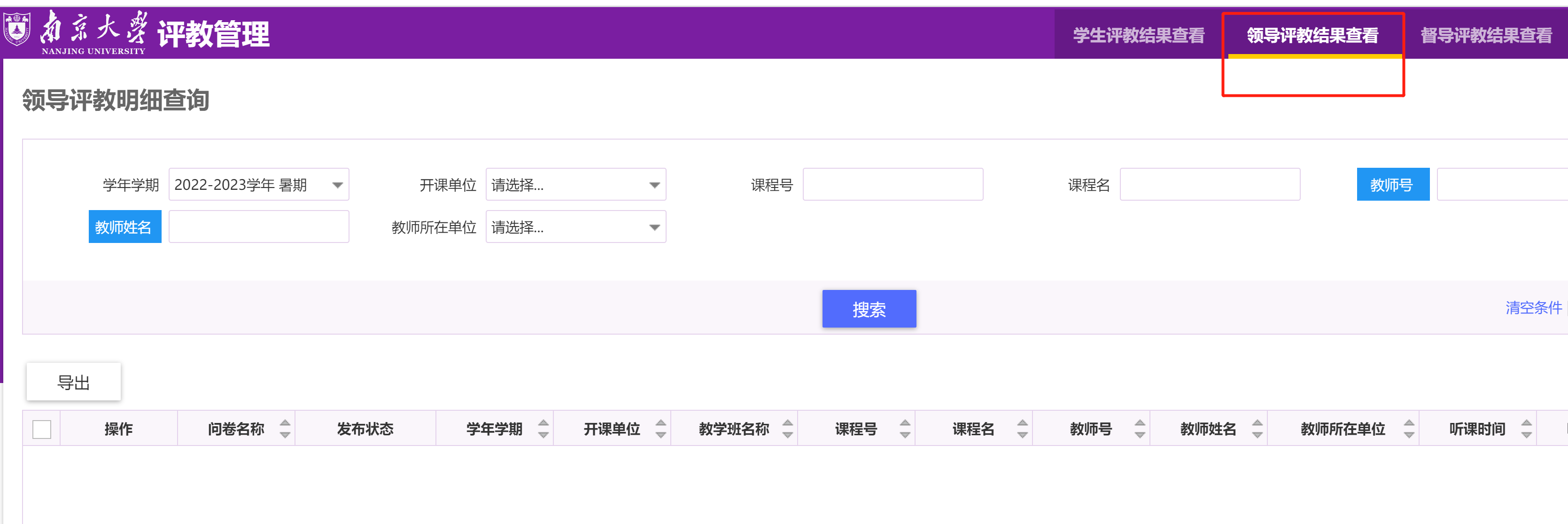 2. 查询领导评教结果:点击上方菜单栏“领导评教结果查看”,在搜索条件里选择学年学期,进行查询。