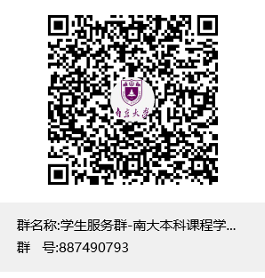 为方便同学们使用本科课程作业查重功能,已建立“学生服务群-南大本科课程学习全过程综合培养平台”提供咨询服务,服务交流QQ群号:887490793(或扫码进群),同学入群请实名备注“院系/单位+姓名”。本群仅向学生开放,请勿加错。