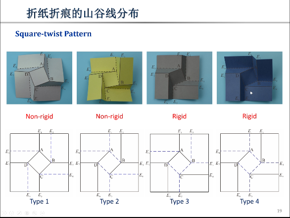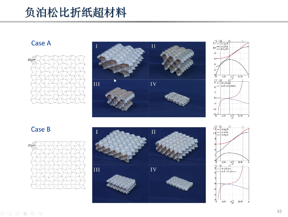 报告中介绍了基于刚性折纸来设计和分析超材料的方法。首先,从机构运动学角度来设计折痕的分布。其中,采用刚性折纸机构运动学模型可以很好的预估材料中间构型的变化,同时配合折纸折痕的山谷线分布设计,可以实现材料刚性折叠或非刚性折叠。