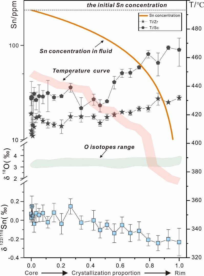 实验结果显示,CL暗区相对于CL亮区显著富集W、Nb、Ta等元素,并表现出更重的锡同位素组成。由于CL暗区不是分布在某个晶体方向,故经典的protosite模型难以解释CL暗区Sn同位素更重且富集特定元素这一特征。本研究提出,锡石晶面相邻区易形成位错与晶格缺陷等局部结构复杂性,促进微量元素的选择性进入,并滞留相对较重的锡同位素,从而在晶体尺度形成稳定而可识别的差异特征。基于对锡石晶体核部向边缘的生长环带的系统分析,发现锡同位素与微量元素呈协同演化,体现了封闭体系中锡石连续结晶的瑞利分馏(图2)。