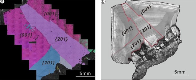 图1维拉斯托锡石晶体的EBSD解析图以及与CL图像的对比。(a)晶体以{001}取向的扇区为主(粉色),中心及下部可见一对与{201}平行的孪晶(紫色与蓝色)。(b)结合CL图像,可揭示出阴极发光成像的CL暗区形成于不同晶界的相邻区。