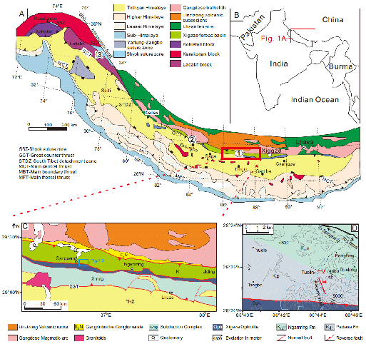 图1研究区地质概况。(A)印度北缘与亚洲南缘以印度河-雅江缝合带(Indus-Yarlung suture zone)为界,日喀则弧前盆地桑桑剖面(1),错江顶剖面(2)及KLA的位置(3); (C,D)本研究桑桑剖面的位置及邻区地质