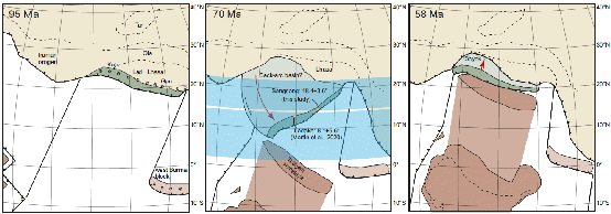 印度-亚洲大陆碰撞是新生代重大地质事件,它标志着新特提斯洋演化的终结,开启了波澜壮阔的陆-陆碰撞造山过程,造就了世界屋脊—青藏高原,并对亚洲陆表环境和生物多样性产生了深刻影响。然而,对于印度-亚洲大陆碰撞发生的时间、位置以及驱动机制等仍存在很大争议。解决这些争议的一个关键在于厘清临碰撞发生前、白垩纪晚期亚洲南缘的大地构造背景。具体而言,就是北向漂移的印度板块与亚洲大陆南缘的汇聚过程是通过一个俯冲带,还是两个俯冲带完成的?这两种不同的认识源于对东-西绵延数千公里的印度河-雅江缝合带(Indus-Yarlung suture zone)中SSZ(supra-subduction zone)型蛇绿岩及相关变质、沉积记录(图1)的不同解释。在缝合带东段(~86°E经度),日喀则弧前盆地早白垩世和始新世岩石的古地磁结果显示其处于北纬16-20°N,紧邻亚洲大陆南缘,表明早白垩世以来在亚洲南缘存在一个稳定的洋-陆俯冲带。缝合带向西逐渐变宽,在西段(~72-77°E经度)出现柯希斯坦-拉达克洋内弧(Kohistan-Ladakh intra-oceanic arc, KLA),其南侧以印度河缝合带(Indus suture)为界,北侧与Shyok缝合带(Shyok suture)相接(图1),指示曾存在两个俯冲带,一个紧邻亚洲南缘—以Shyok缝合带为标志,另一个则更靠南,在KLA的南侧—以印度河缝合带(Indus suture)为标志。有意思的是,KLA上~90 Ma的沉积物来源于亚洲大陆,说明KLA在~90 Ma时处于很靠近亚洲大陆南缘的位置,而KLA上~66 Ma岩石的古地磁结果显示KLA在~66 Ma时位于赤道附近,即在亚洲南缘以南约2000 km的位置。为解释这两个KLA古地理位置迥异的结果,Kapp and DeCelles (2019)认为白垩纪晚期亚洲南缘发生了强烈的弧后扩张,导致包含KLA-日喀则弧前的块体从亚洲南缘裂离,漂移至赤道附近,之后弧后盆地沿Shyok缝合带及其东延的构造带关闭。东延构造带与现今的冈底斯逆冲推覆带(Gangdese thrust,GT)重合。该“弧后扩张”模型有两个显著特征:(1)KLA-冈底斯弧在晚白垩世(~90-66 Ma)经历了大幅度南向漂移,到达赤道附近;(2)印度板块北向汇聚的应变沿印度河-雅江缝合带(Indus-Yarlung suture zone)在侧向上是均匀分配的。
