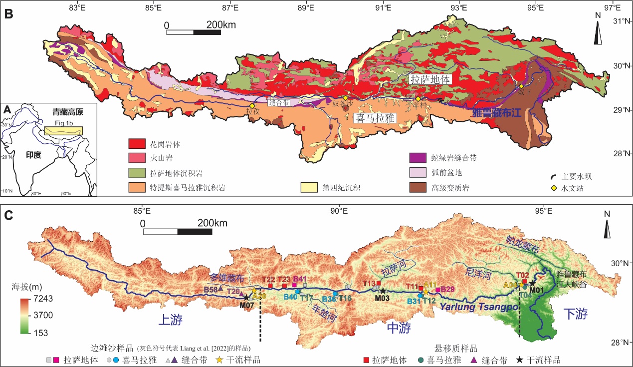 图1雅鲁藏布江流域地理位置(A)、地质(B)及采样分布(C)。