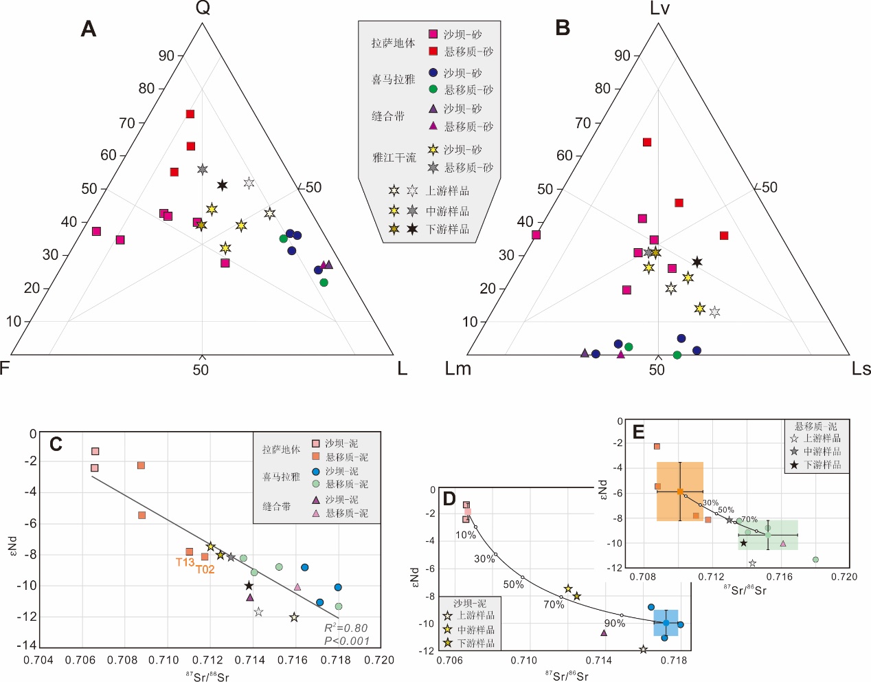 图2雅鲁藏布江沙坝和悬移质中砂的碎屑组分(A、B)和Sr-Nd同位素特征(C-E)。