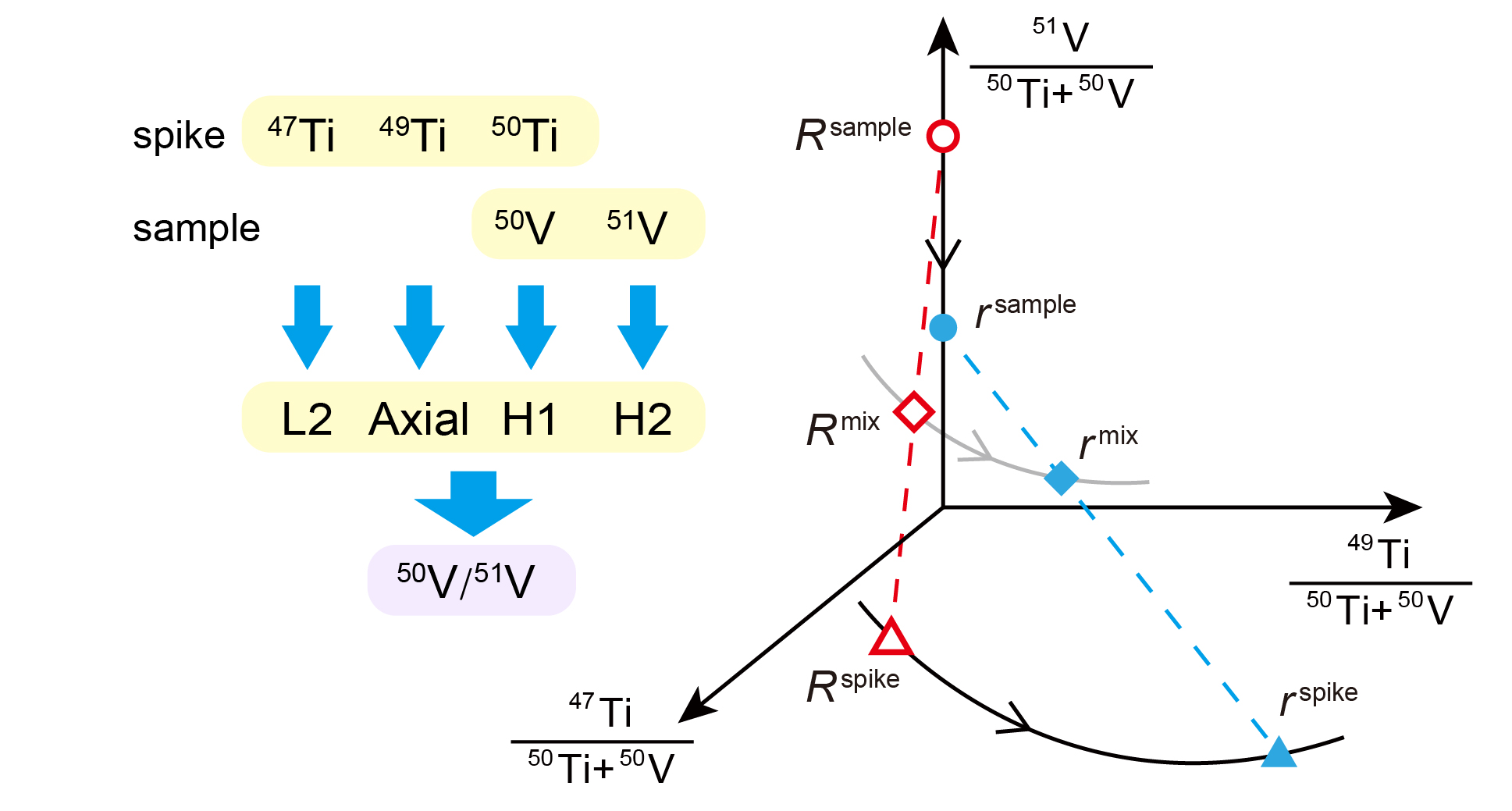 在同位素分析领域中,同位素的绝对比值具有重要意义。同位素绝对比值决定了元素的原子量,也是同位素分析化学的根本参数。例如,在质谱元素和同位素测量过程中的各种干扰校正都需要使用高精度的同位素绝对比值以保证结果的准确性。然而,许多现有的同位素绝对比值数据精度较差。尤其对于钒、铟等同位素少于4个、同时受到其他同重素干扰的元素,由于无法使用双稀释剂法、外部校正法等现有的绝对比值测试方法,仍然缺乏高精度的同位素绝对比值数据。