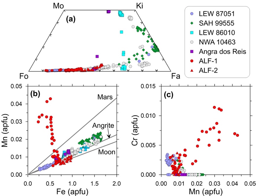 图2、SaU 290陨石中似Angrite岩屑(ALF-1和ALF-2)中橄榄石的成分特征