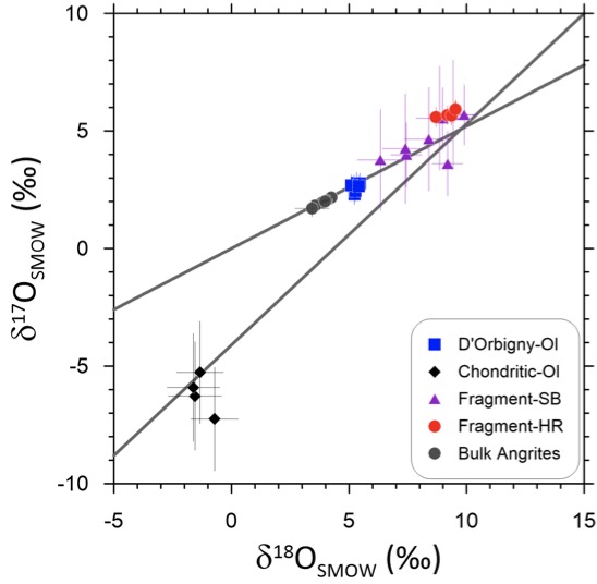 图3、SaU 290陨石中似Angrite岩屑中矿物的氧同位素组成和Angrite陨石及其组成矿物氧同位素组成的对比