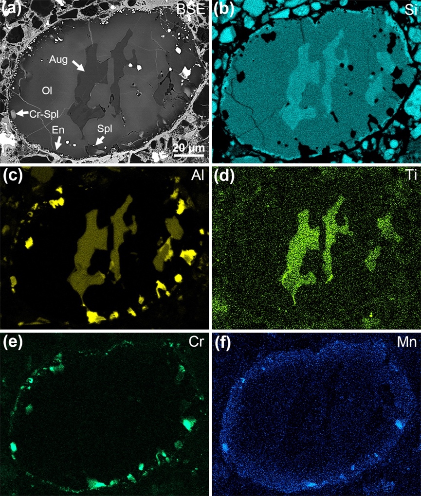 这两个岩屑均主要由富铁富钙的橄榄石组成,含有少量富铝富钛普通辉石、钙长石、陨磷钙钠石、铬铁矿、尖晶石和FeNi金属(图1)。这两个岩屑主体的矿物组合和矿物成分特征与Angrite陨石几乎一致(图2),不同于其他已知球粒陨石或者无球粒陨石(硅酸盐为主的非球粒陨石)。但是精细矿物学观察和高精度离子探针同位素组成研究揭示了这两个岩屑有几方面特征不同于Angrite陨石。一是这两个岩屑橄榄石的氧同位素组成(17O=0.9 ± 0.18‰)明显高于Angrite陨石橄榄石的氧同位素组成(17O=-0.14 ± 0.30‰)(图3)。二是这两个岩屑主体均呈现复杂的热变质记录,并导致了外来的Mn和Cr从岩屑边缘向内部扩散(图4)。三是其中一个岩屑ALF-1还有细粒低钙辉石边(含有少量普通辉石),而Angrite陨石中是不含有低钙辉石的。这些差异表明这两个岩屑和Angrite陨石具有不同的母体,可能来自于一个未曾观察过的新类型星子,而且经历了非常复杂的热事件。其中岩屑ALF-1中的Mn和Cr扩散带及低钙辉石边很可能是在星云环境形成的,而且其形成区域应该不同于岩屑的母体和CH球粒陨石母体形成区域,因为岩屑的母体和CH群陨石球粒形成区域都具有贫Mn和Cr的特征。