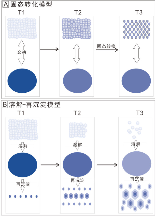 碳酸盐矿物是自然界广泛存在的一类重要矿物,其微量元素特征和C、O、Sr、Ca以及Mg等同位素组成特征蕴含了重要的沉积环境以及古气候等相关信息。已有研究表明,碳酸盐矿物可由一种富水,亚稳态的无定形前驱物转换而来。而目前共有两种机制来解释此转换过程,分别为固态转换机制和溶解再沉淀机制,这两种不同的转换机制会导致最后形成的碳酸盐矿物蕴含截然不同的地球化学信息。因此,确定无定形物向结晶态碳酸盐矿物的转换机制对更好的把地球化学手段应用于地质记录中的碳酸盐岩研究是十分重要的。