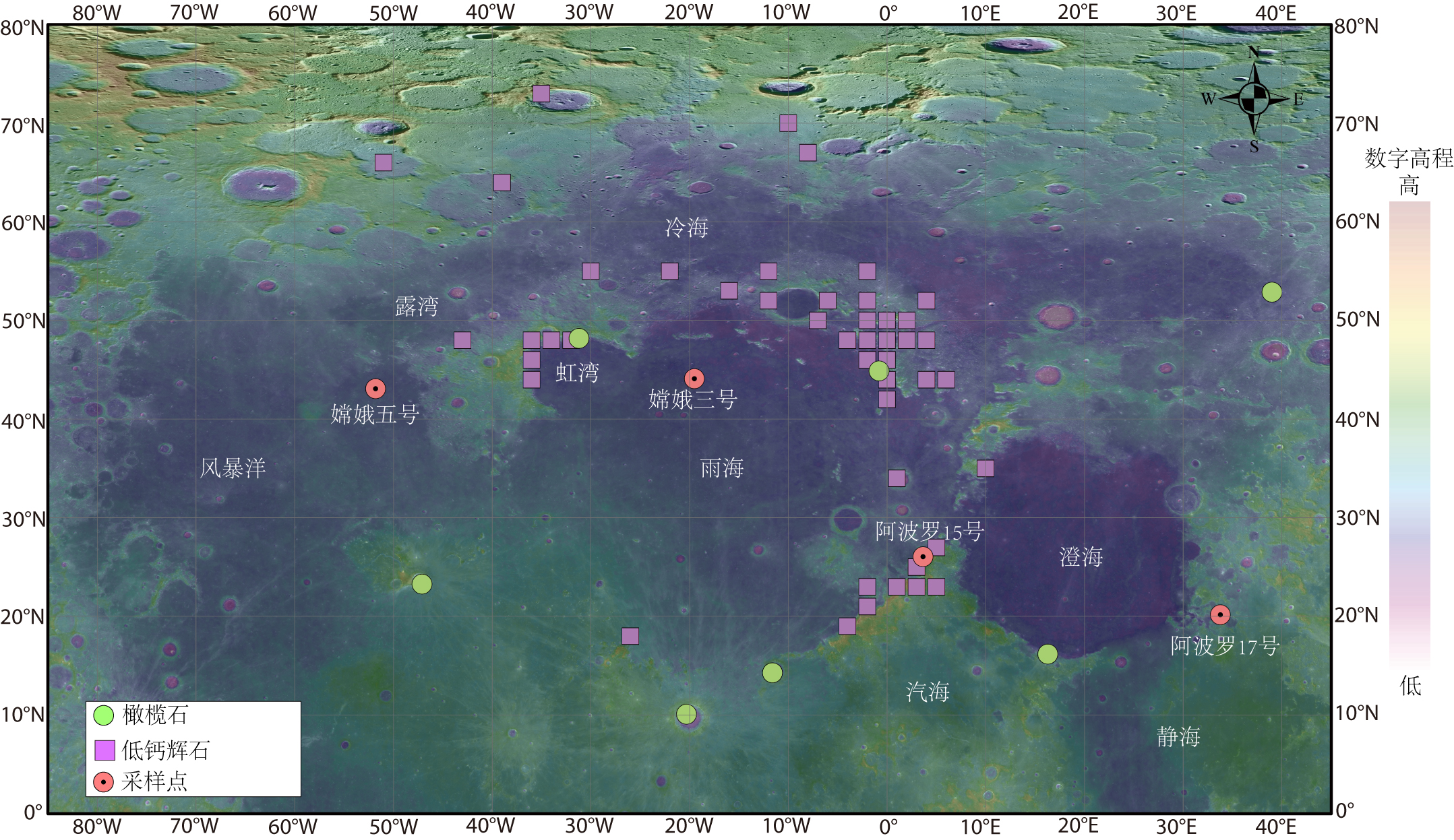 图5.高镁玻璃珠的可能来源区域。低钙辉石和橄榄石露头的位置集中在雨海盆地边缘。
