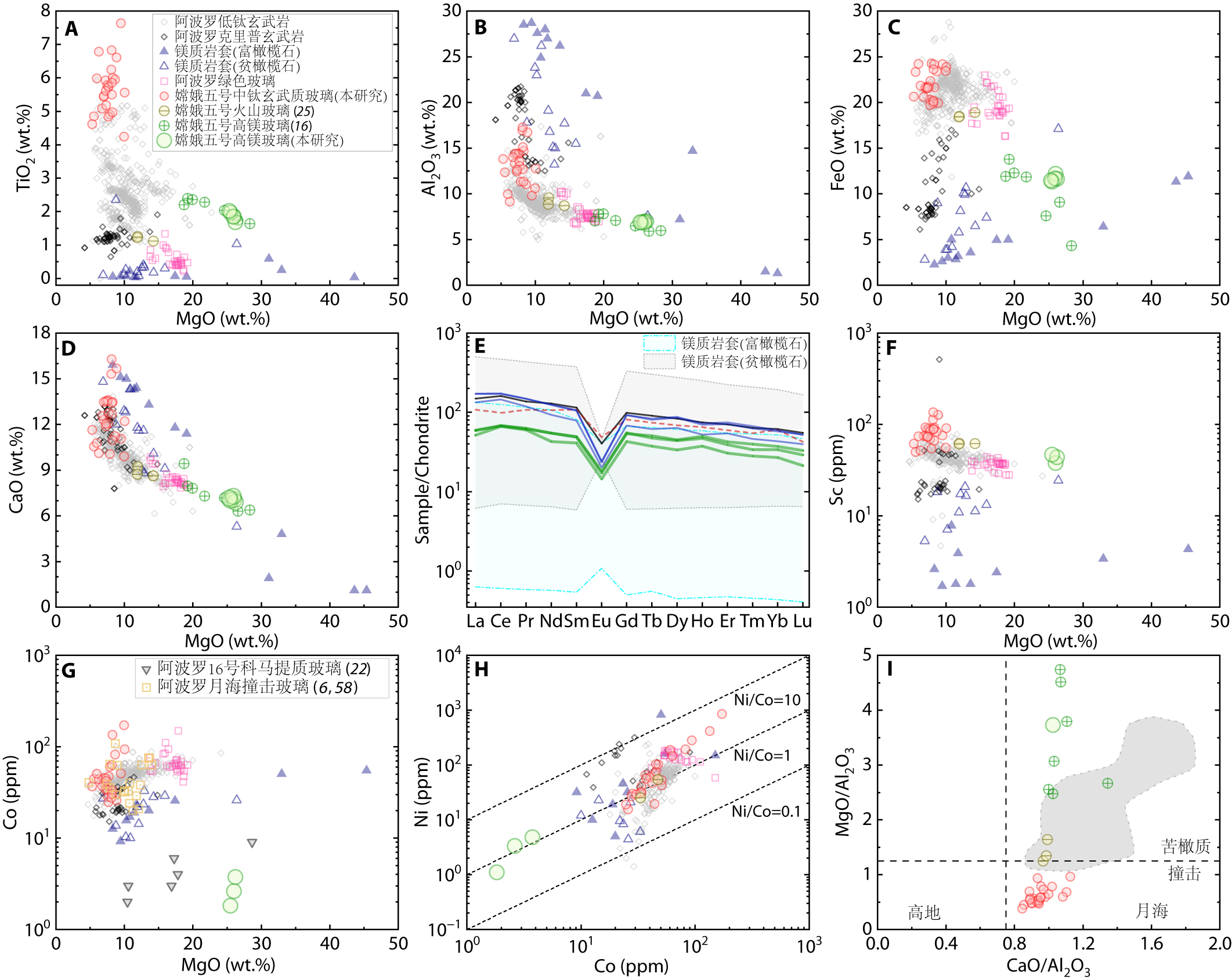 图2.高镁玻璃G1-GB-1的化学组成。(A–D)主量元素与MgO的二元图解。(E)高镁玻璃(绿色实线),中钛玄武质玻璃的平均(红色虚线)和嫦娥五号火山玻璃珠(蓝色实线)的稀土元素球粒陨石归一化模式图。(F–G)部分微量元素与MgO的二元图解。(H) Co和Ni含量的二元图解。(I) CaO/Al2O3比和MgO/Al2O3比的二元图解,区分火山成因和撞击成因玻璃珠。灰色阴影区域为阿波罗样品中的火山玻璃珠。
