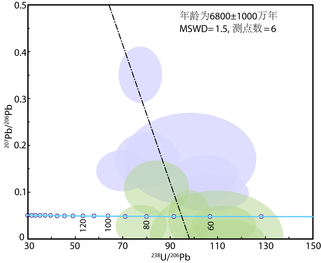 图3.高镁玻璃G1-GB-1的U-Pb年龄。紫色误差椭圆为未校正数据,绿色误差椭圆为校正后数据。