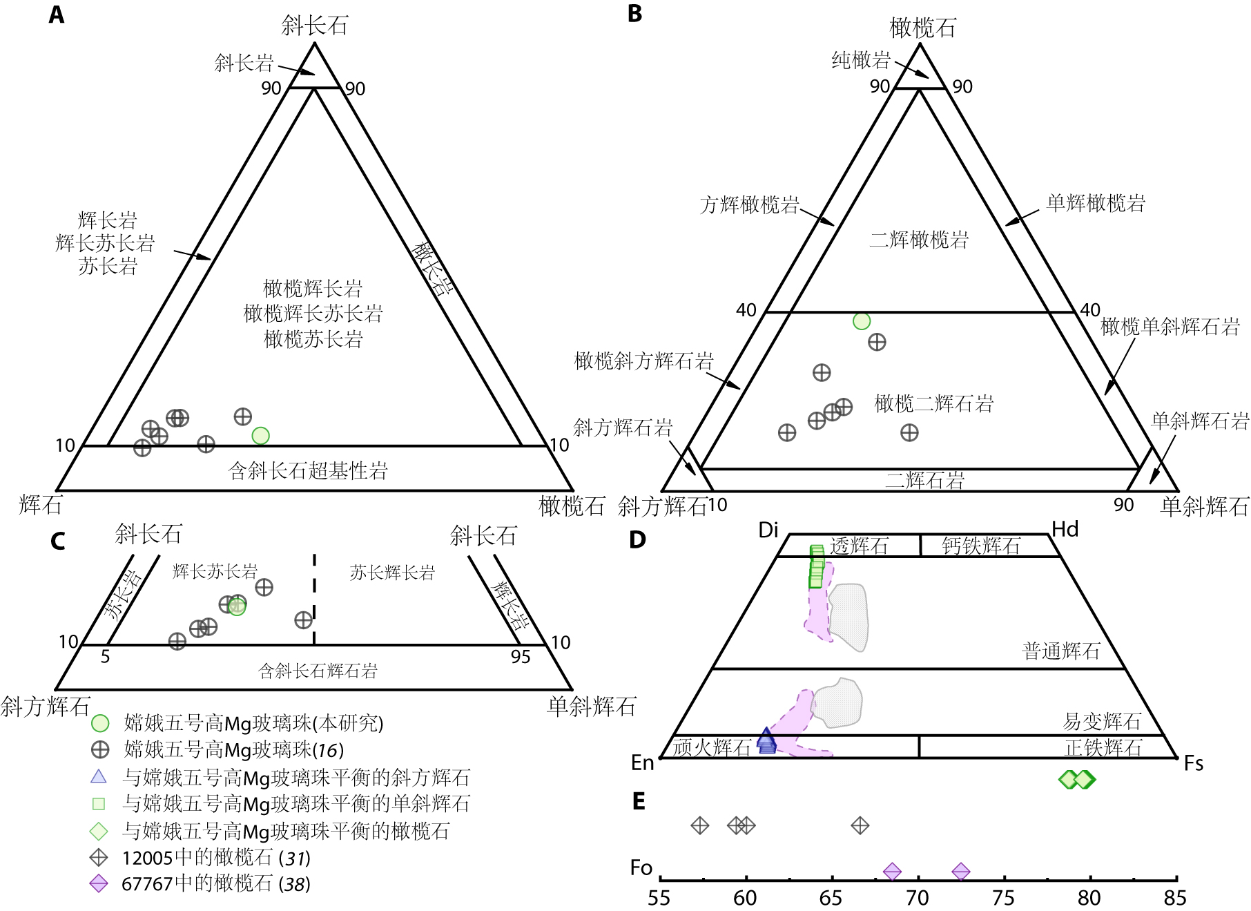 图4.嫦娥五号高镁玻璃珠的相平衡模拟结果。(A–C)原岩的平均矿物模式比例。(D–E)高镁玻璃平衡相中辉石和橄榄石的成分。67767和12005中辉石的成分范围分别用紫色和灰色表示。