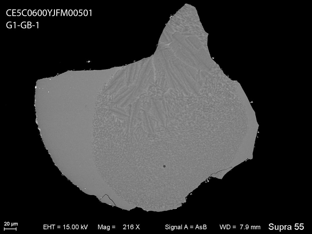 图1.嫦娥五号月壤样品CE5C0600YJFM00501中高镁玻璃G1-GB-1的背散射电子图像
