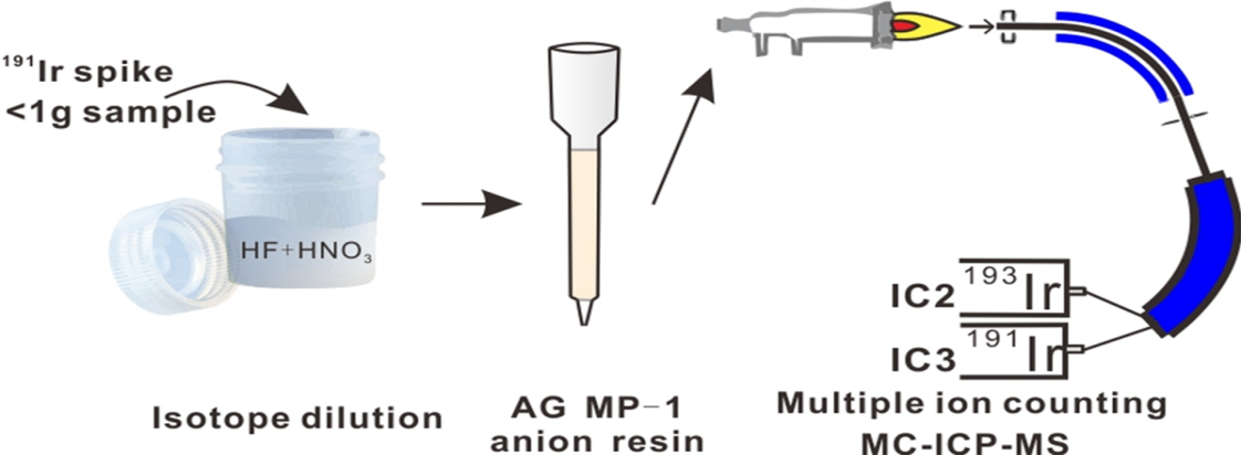 南京大学关键地球物质循环与成矿全国重点实验室李伟强教授团队基于同位素稀释法与MC-ICP-MS多离子计数系统开展研究,实现了少量(<1 g)地质样品中超微量铱(pg/g)的准确测定,并将该方法成功应用在晚始新世天体撞击事件的示踪研究中,取得重要新进展。