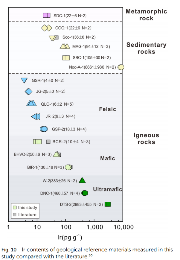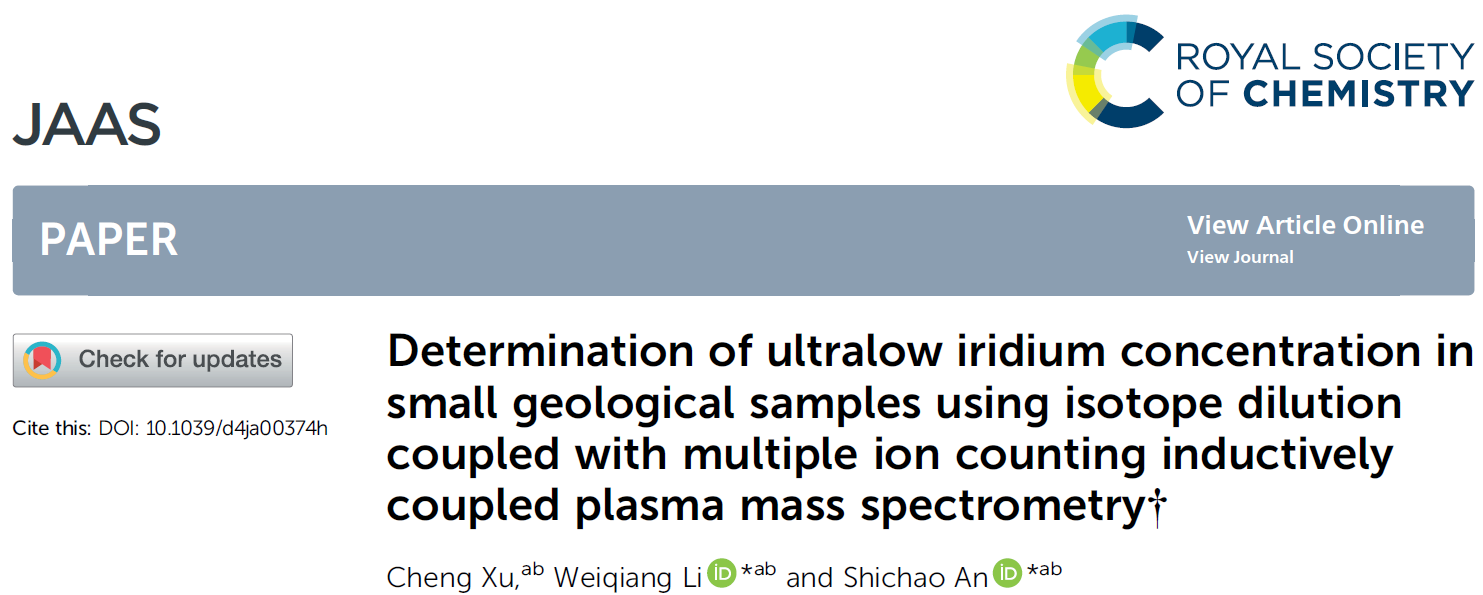Xu C., Li W., and An S. (2025) Determination of ultralow iridium concentration in small geological samples using isotope dilution coupled with multiple ion counting inductively coupled plasma mass spectrometry: Journal of Analytical Atomic Spectrometry.https://doi.org/10.1039/D4JA00374H