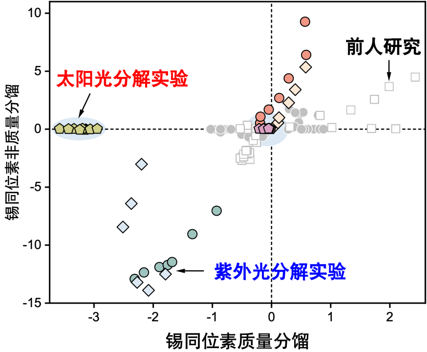 据此提出,锡的磁性同位素非质量分馏信号可作为光化学“指纹”,有应用于追溯大氧化(GOE)事件前后大气环境转变的潜力。在太古代低氧环境中,短波长紫外线可穿透大气层,使水体和大气中的有机锡产生非质量同位素分馏;大氧化事件后,臭氧层的形成屏蔽了短波长紫外线辐射,导致非质量分馏信号消失。这为示踪早期地球环境演变提供了全新思路和技术途径。