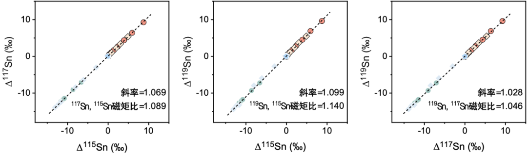 关键元素的同位素非质量分馏效应,如硫、汞等,被广泛应用于研究早期地球环境、行星过程、物质循环等重大科学问题,取得良好效果,主要出现于奇数的磁性同位素(如33S、199Hg、201Hg)。前人研究也发现锡的磁性同位素具有非质量分馏效应,展现出重要的应用潜力。但关于锡的磁性同位素的非质量分馏效应机理存在巨大争议。法国巴黎地球物理研究所Moynier教授团队提出“核体积效应”说,英国国家计量实验室的Malinovsky博士提出“磁同位素效应”说,日本的Fukami博士等人则主张“磁同位素效应”和“核体积效应”同时存在。以上前人工作均基于非自然条件的特殊室内实验,因此虽然观察到锡同位素非质量分馏效应,但无法直接应用于天然样品研究,领域研究存在空白。