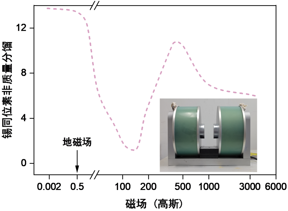图2光分解实验锡同位素非质量分馏与磁场强度关系,右下为自主设计制造的磁场调控设备。