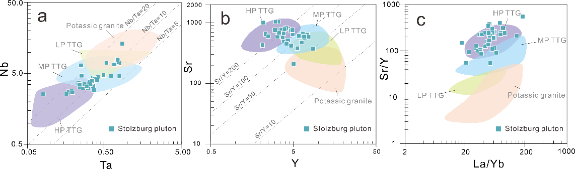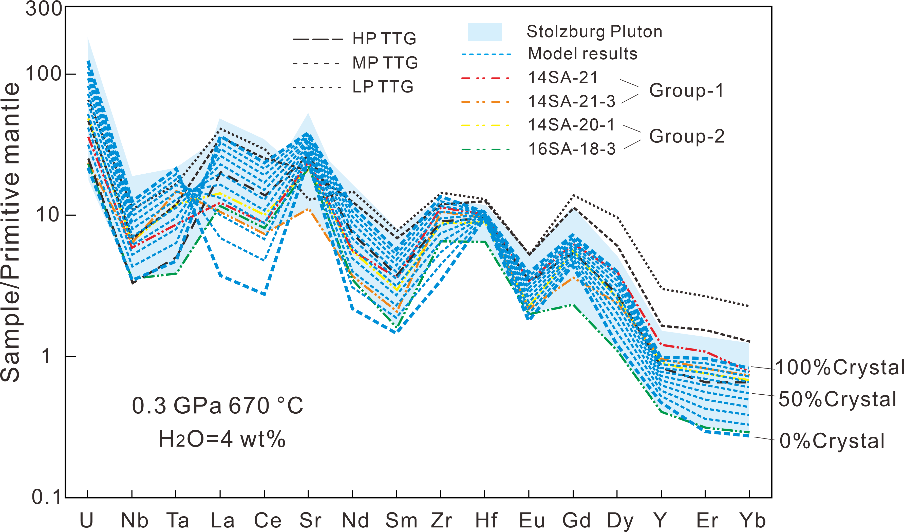针对这一科学问题,南京大学内生金属矿床成矿机制研究国家重点实验室王孝磊教授课题组通过对南非巴伯顿(Barberton)地区的花岗-绿岩带中34.5亿年的Stolzburg TTG岩体开展一系列岩相学、矿物学分析和热力学、地球化学模拟工作,提出在TTG岩浆结晶分异的过程中,副矿物的不均匀分布是导致其微量元素变化的主要因素。研究发现,巴伯顿花岗绿岩带中Stolzburg岩体的岩石成分具有极大的成分变化,在传统的TTG压力分类图解上,高压-中压-低压-钾质四个区域都有分布(图1),而且不同类型的岩石有的还采自同一个露头区。岩石的相平衡模拟和地球化学计算结果表明(图2),要形成这样成分变化极大、在短时间内侵位且同位素均一的岩体,需要一个成分均一的地壳源区在至少在36-60 km深度范围内同时发生熔融,产生熔体并向上侵位到同一深度。这对于Stolzburg这么一个不大的岩体来说 (约130 km2),显然不太合理;目前所提出的几种太古宙可能存在的构造模式均不能很好的解释这一过程。因此,有必要仔细分析TTG岩石成分变化的根本控制因素。