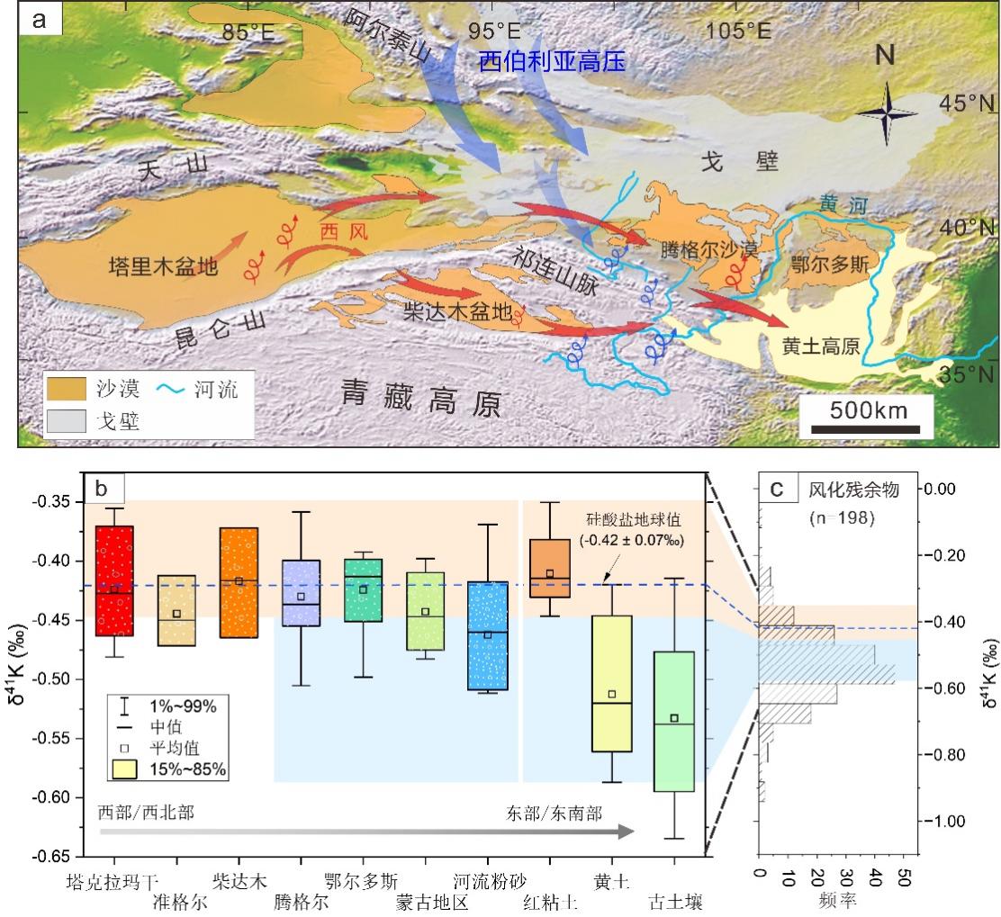 图2东亚粉尘运输示意图与潜在源区物质K同位素值变化。(a)第四纪气候变冷时期粉尘运输模式图;(b)潜在源区物质与粉尘沉积物δ41K值箱线图;(c)上陆壳风化产物δ41K数据统计直方图。硅酸盐地球的δ41K值引自Hu et al. (2021)。