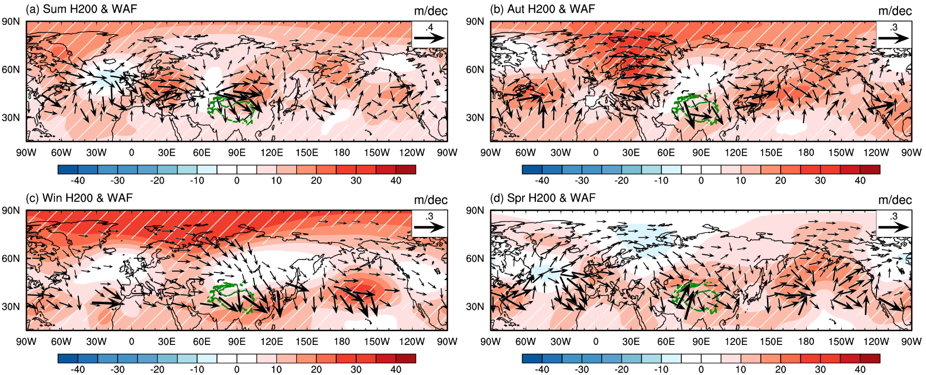 图5各季节平均的200hPa位势高度(阴影;单位:m/dec)线性趋势和波作用通量(箭头;单位:m2/s2)的空间分布。其中斜划线表示该区域的位势高度趋势通过90%置信度的显著性检验,绿色曲线内为海拔高度大于2500 m的高原地区。