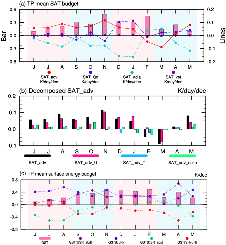 图4高原区域平均的(a)地表气温异常趋势(单位:K/dec)和热力学方程中各倾向项异常趋势逐月演变(单位:K/day/dec),(b)水平温度平流和分别由环流和温度异常导致的水平温度平流以及非线性水平温度平流异常趋势(单位:K/day/dec),(c)地表温度异常和各辐射和热通量项导致的地表温度异常趋势逐月演变(单位:K /dec)