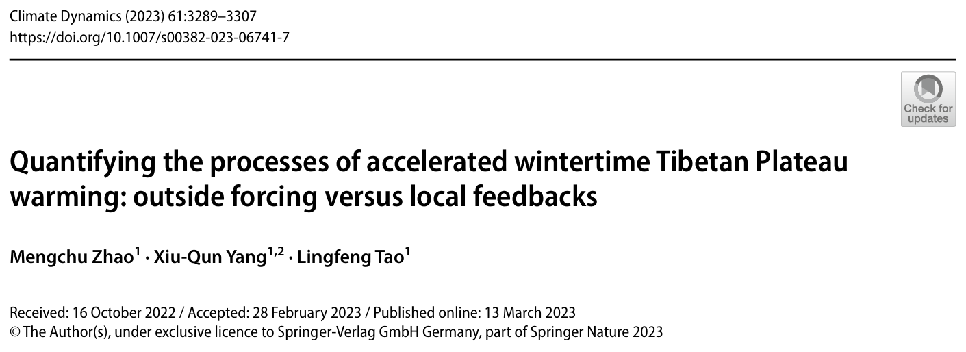 Zhao, M., Yang, X-Q. & Tao, L. Quantifying the processes of accelerated wintertime Tibetan Plateau warming: outside forcing versus local feedbacks.Climate Dynamics,61, 3289–3307 (2023). https://doi.org/10.1007/s00382-023-06741-7