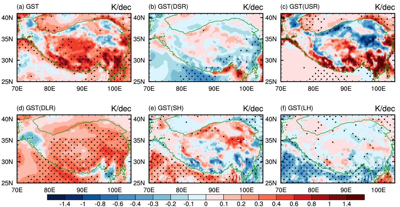 图2(a)地表温度异常及由(b)向下短波辐射、(c)向上短波辐射、(d)向下长波辐射、(e)感热通量和(f)潜热通量变化导致的地表温度异常趋势(单位:K/dec)。其中黑色打点表示该区域变量线性趋势通过95%置信度的显著性检验,绿色曲线内为海拔高度大于2500 m的高原地区。
