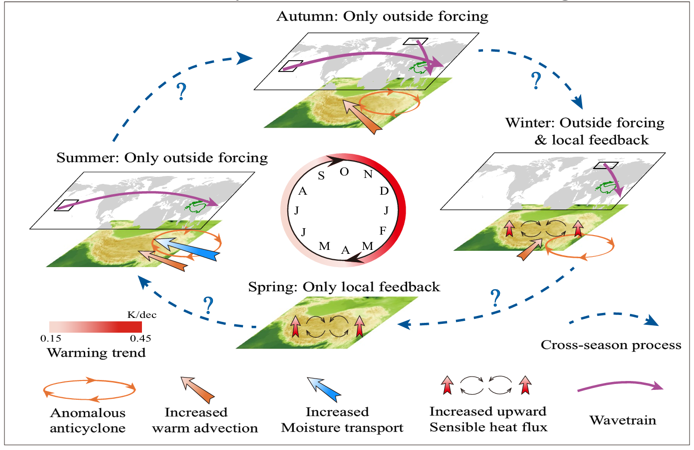全球变暖背景下青藏高原变暖趋势显著强于周边地区或北半球平均,从上世纪八十年代起高原变暖速度进一步加快。青藏高原加速变暖涉及全球变暖背景下高原地表积雪减少、高原大气变湿以及外部大气环流异常强迫等复杂过程,但这些过程的相对作用尚不清晰。高原加速变暖在秋冬季强、春夏季弱,这种季节差异的形成机制也需深入探究。最近,在国家重点研发计划项目(2022YFE0106600)和国家自然科学基金创新研究群体项目(41621005)的共同资助下,南京大学大气科学学院杨修群教授团队在Climate Dynamics上连续发表了两篇论文(第一作者为赵萌初博士,通讯作者为杨修群教授),从外部强迫和局地反馈过程的相对作用视角,解析了青藏高原加速变暖及其季节差异的形成机制。