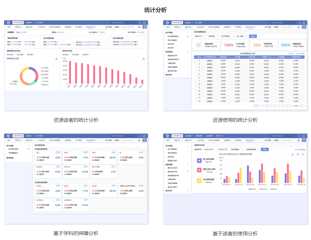1、支持对纸质、电子、数字资源以及用户行为进行图书馆相关需求维度的数据统计与分析;