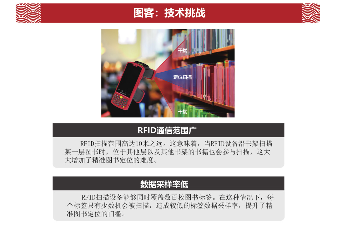 手持RFID设备扫描:存在图书漏读率高、定位精度低,操作繁琐等缺陷。