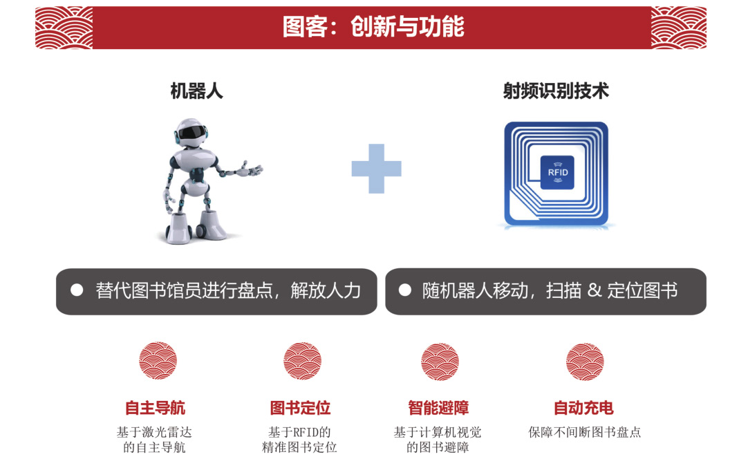 “图客”将RFID感知、计算机视觉和智能机器人技术进行有机结合。“图客”沿书架逐层扫描图书,通过RFID阅读器定位图书内嵌的RFID芯片,实现了精确、可靠的全自动图书盘点。一旦发现图书错架,可以实时显示其错架位置。