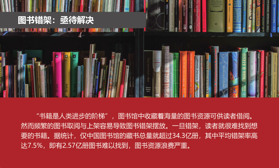 “书籍是人类进步的阶梯”,图书馆中收藏着海量的图书资源可供读者借阅。然而频繁的图书取阅与上架容易导致图书错架摆放。一旦错架,读者就很难找到想要的书籍,造成图书资源的严重浪费。