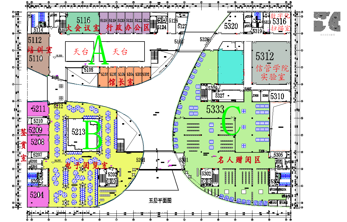 五层平面布局说明 A 区为行政办公区,B 区电子阅览室、音乐鉴赏室,C 区为名人赠阅区