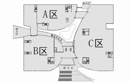 一层平面布局说明 A 区为办公区,B 区为报告厅、展厅,C 区为密集书库、教室