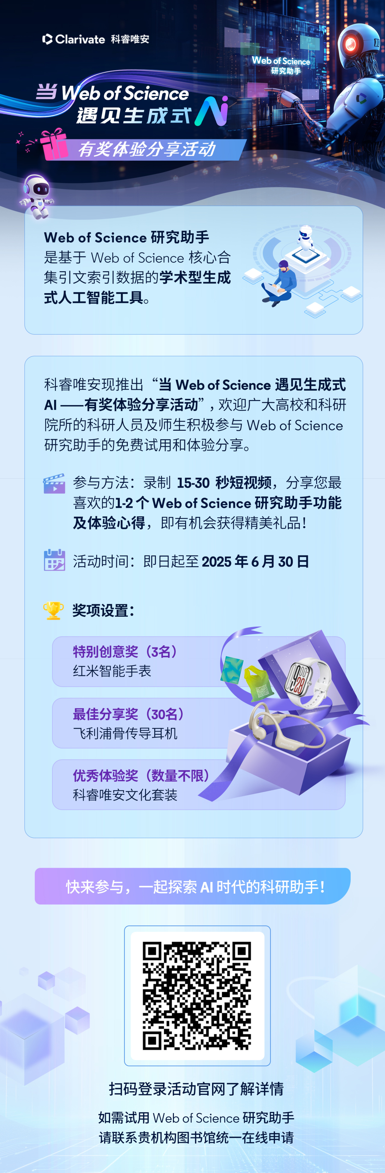 为助力高校及科研机构的科研人员与师生高效地使用 Web of Science 研究助手开展科研工作和学习,提升人工智能素养,助力智慧科研。科睿唯安现推出“当 Web of Science 遇见生成式AI——有奖体验分享活动”。欢迎感兴趣的各高校和科研机构的科研人员及师生积极参与!