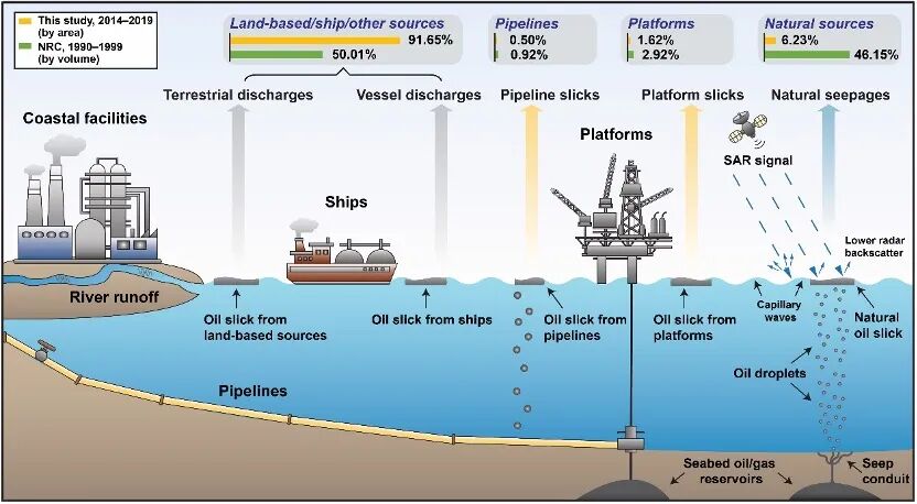 图1. 海面油膜来源(天然烃渗漏、油气平台/管道、船舶及陆源排放)与贡献