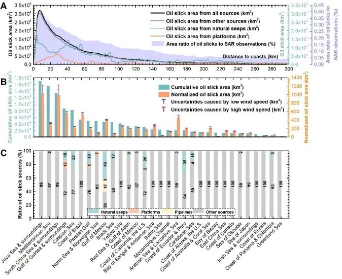 图2. 全球海面油膜距岸分布直方图(A)、各海区油膜累积面积和归一化面积(B)及不同来源油膜占比(C)