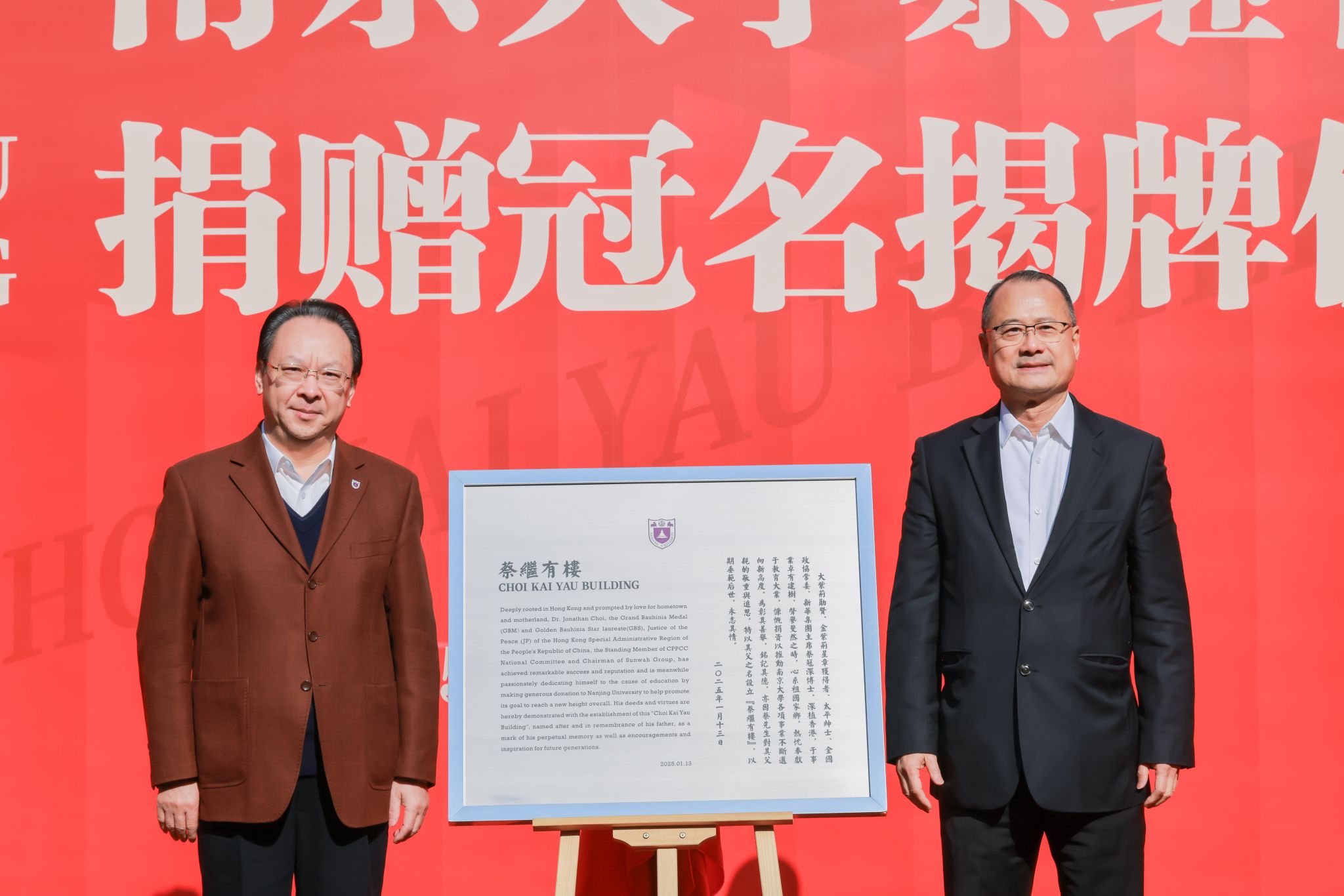 1月13日,南京大学“蔡继有楼”捐赠冠名揭牌仪式在仙林校区举行。全国政协常委、粤港澳大湾区企业家联盟主席、香港中华总商会会长、新华集团主席蔡冠深博士,全国政协常委、南京大学党委书记、中国科学院院士谭铁牛出席仪式并致辞。