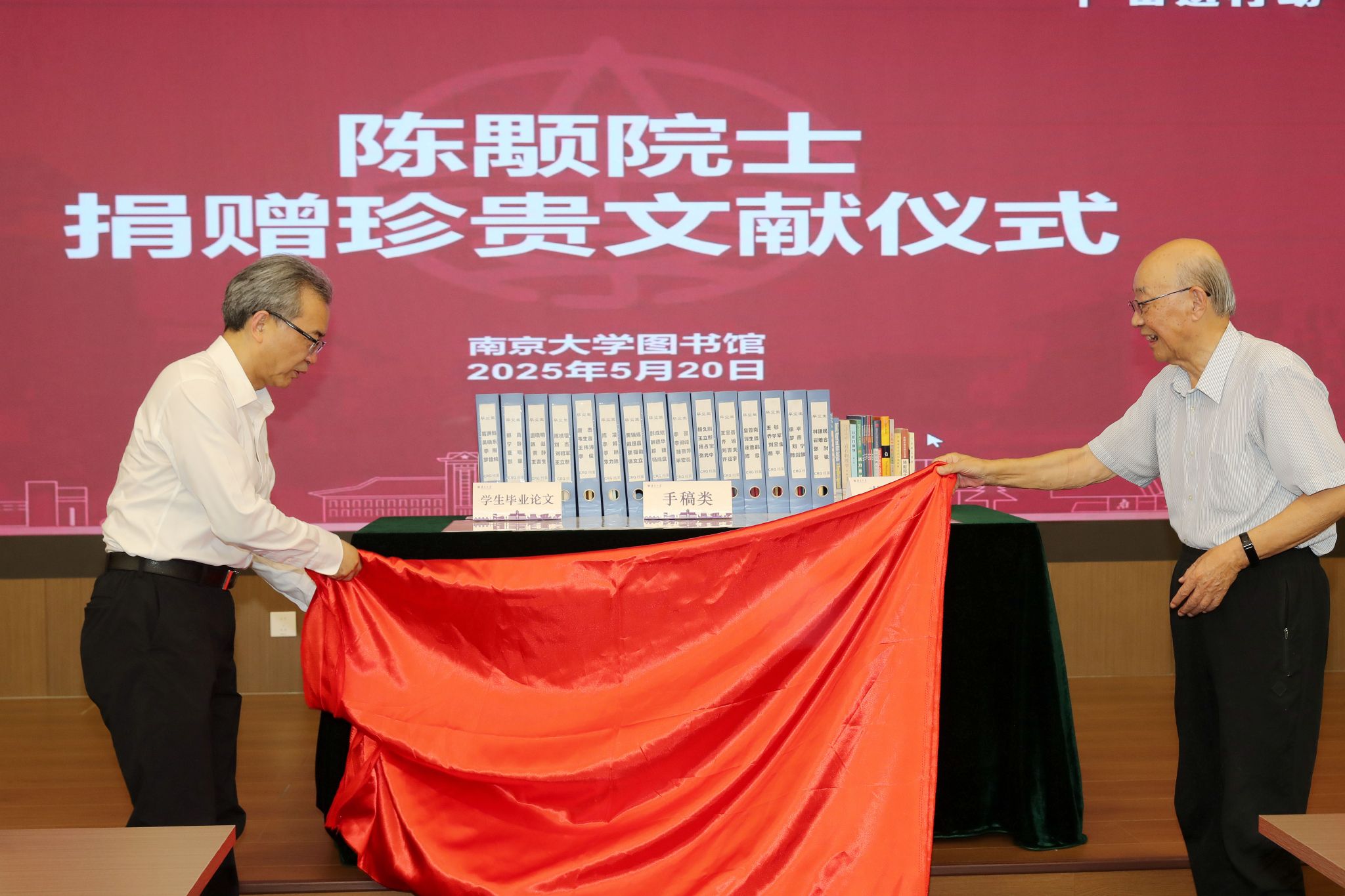 谈哲敏和陈颙院士共同为捐赠珍贵文献揭幕。南京大学图书馆将对这批文献采取专业保护、数字化建设、开放利用和特色展示等举措,以珍视之心与科学管理回应馈赠。