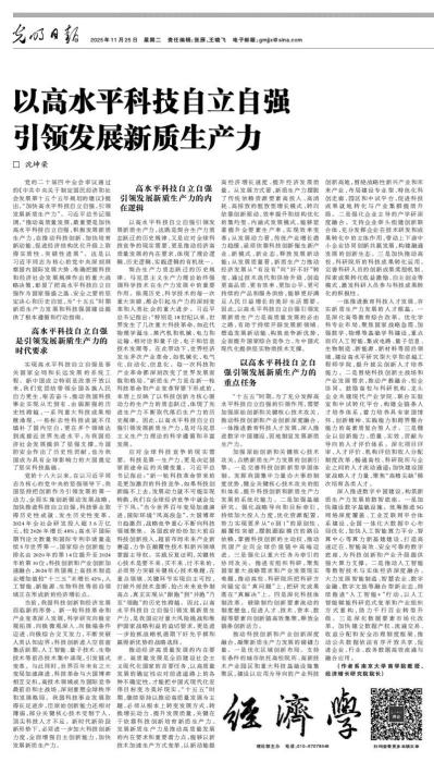 2025年11月25日,我院沈坤荣教授的文章《以高水平科技自立自强引领发展新质生产力》在《光明日报》第11版理论板块正式刊发。(原文如下)